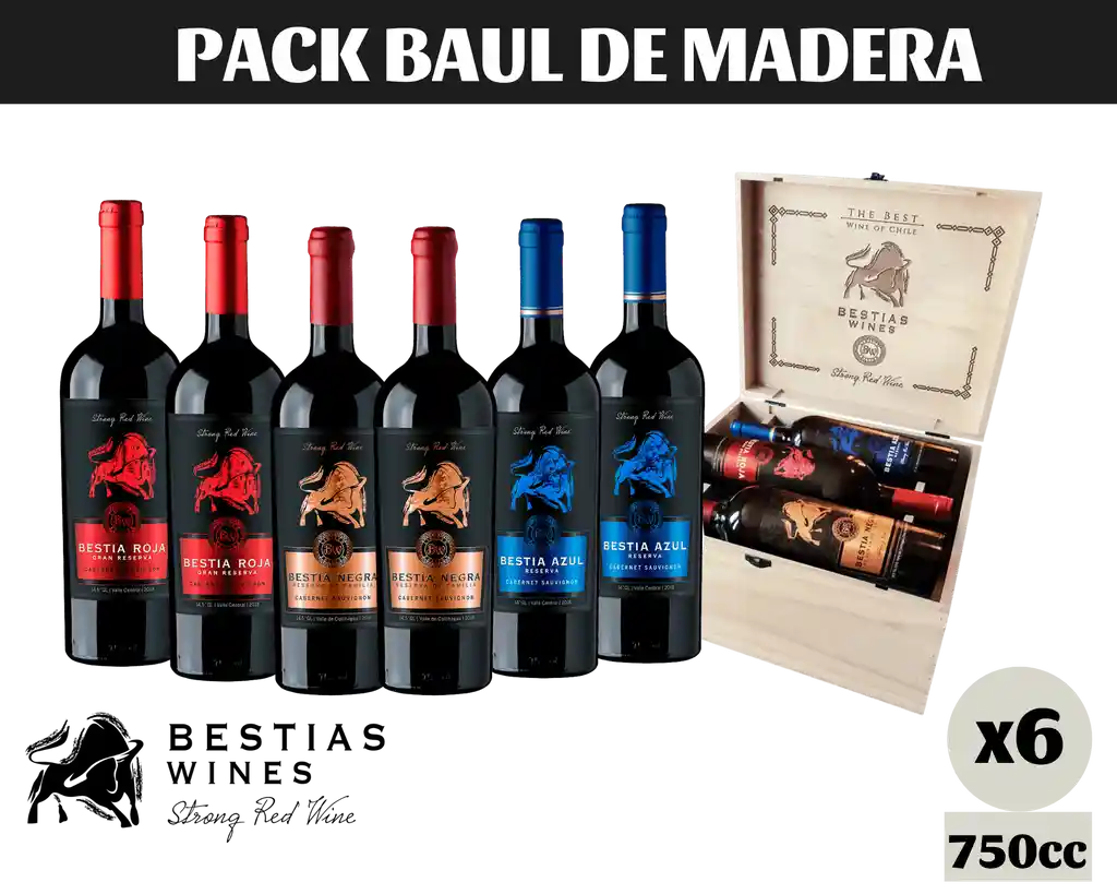 PACK PREMIUM BESTIAS WINES FAMILY PACK 6 UNIDADES EN BAÚL DE MADERA Excelente para regalo. BESTIAS CABERNET SAUVIGNON FAMILY PACK (TOTAL 6 BOTELLAS 750CC) - 2 x Vino Bestia Azul Reserva Cabernet Sauvignon - 2 x Vino Bestia Roja Gran Reserva Cabernet Sauvignon - 2 x Vino Bestia Negra Reserva de Familia Cabernet Sauvignon - 1 x Baúl de Madera con broche y bisagras metálicas