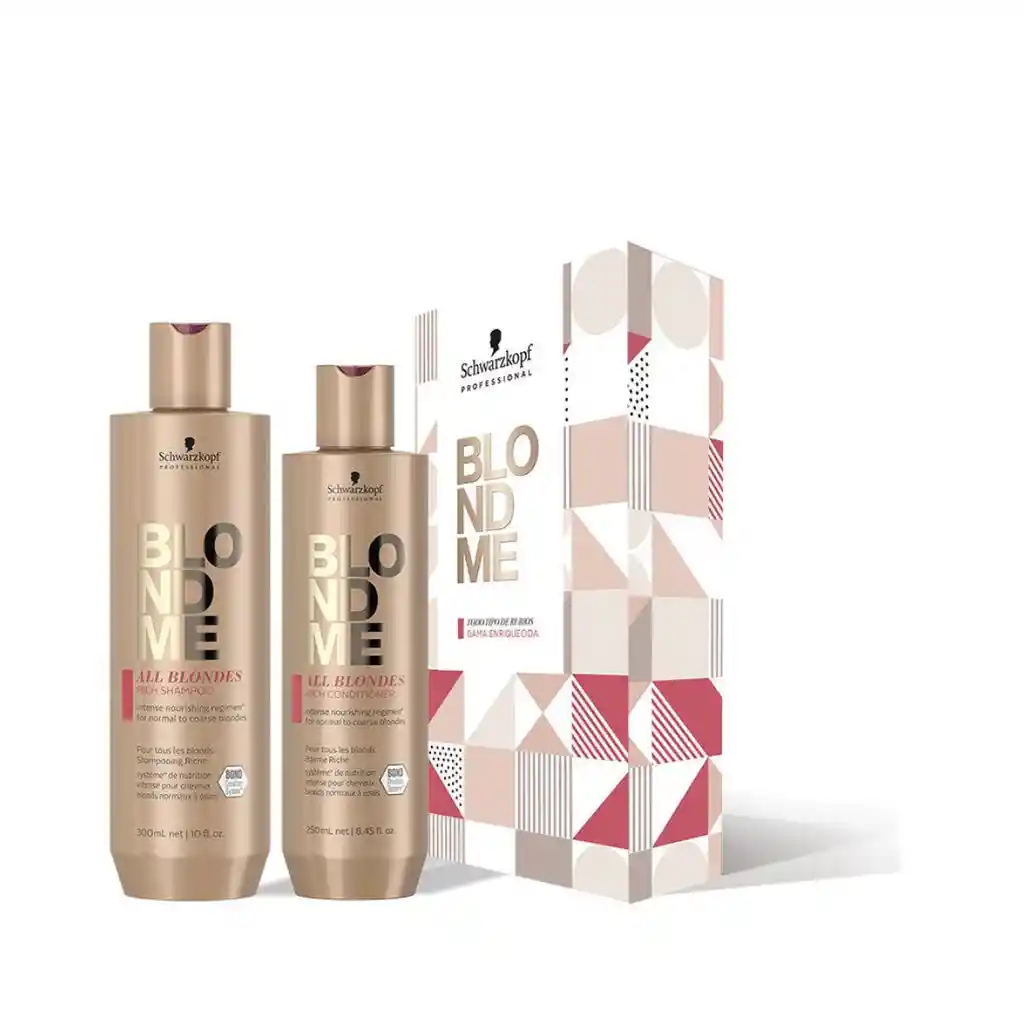 DESCRIPCIÓN DEL PRODUCTO La Gama de Cuidado Enriquecida para Todo Tipo de Rubios contiene la Tecnología 3D Bond Creation y el Complejo Cashmere Protein que reconstruyen y reparan los puentes internos del cabello rubio de normal a grueso. Deja el cabello con un aspecto más nutrido y hasta un 85% más fuerte. BENEFICIOS • Limpia suavemente mientras nutre • Regenera y revitaliza los puentes internos del cabello • Suaviza la superficie del cabello • Deja el cabello suave y con un brillo de aspecto sano" INGREDIENTES PRINCIPALES Sistema de unión avanzado con queratina, restaura las fibras capilares y llena las áreas dañadas, promoviendo un cabello más fuerte y resistente; El pantenol hidrata intensamente y ayuda a equilibrar el contenido de agua natural de la estructura del cabello. CÓMO UTILIZAR Aplique BLONDME Shampoo Keratin sobre el cabello mojado, masajeando desde las raíces hasta las puntas, creando una rica espuma. Luego, enjuague bien y repita si es necesario. Por último, aplique un acondicionador o mascarilla para el cabello. El Acondicionador Enriquecido para Todo Tipo de Rubios de BLONDME, con la Tecnología 3D Bond Creation y el complejo Cashmere Protein, ayuda a crear puentes nuevos mientras desenreda, suaviza y alisa el cabello rubio de normal a grueso. Beneficios: Desenreda al instante el cabello Ayuda a suavizar el cabello y sella la superficie porosa del cabello rubio Mejora la fuerza y la elasticidad Su fórmula con Aceite de Marula ayuda a proporcionar un brillo luminoso Cómo usarlo: Después de lavar el cabello con BLONDME Champú Enriquecido para Todo Tipo de Rubios, aplicarlo sobre cabello secado con toalla Dejar actuar durante 2-3 minutos y enjuagar bien Para uso diario