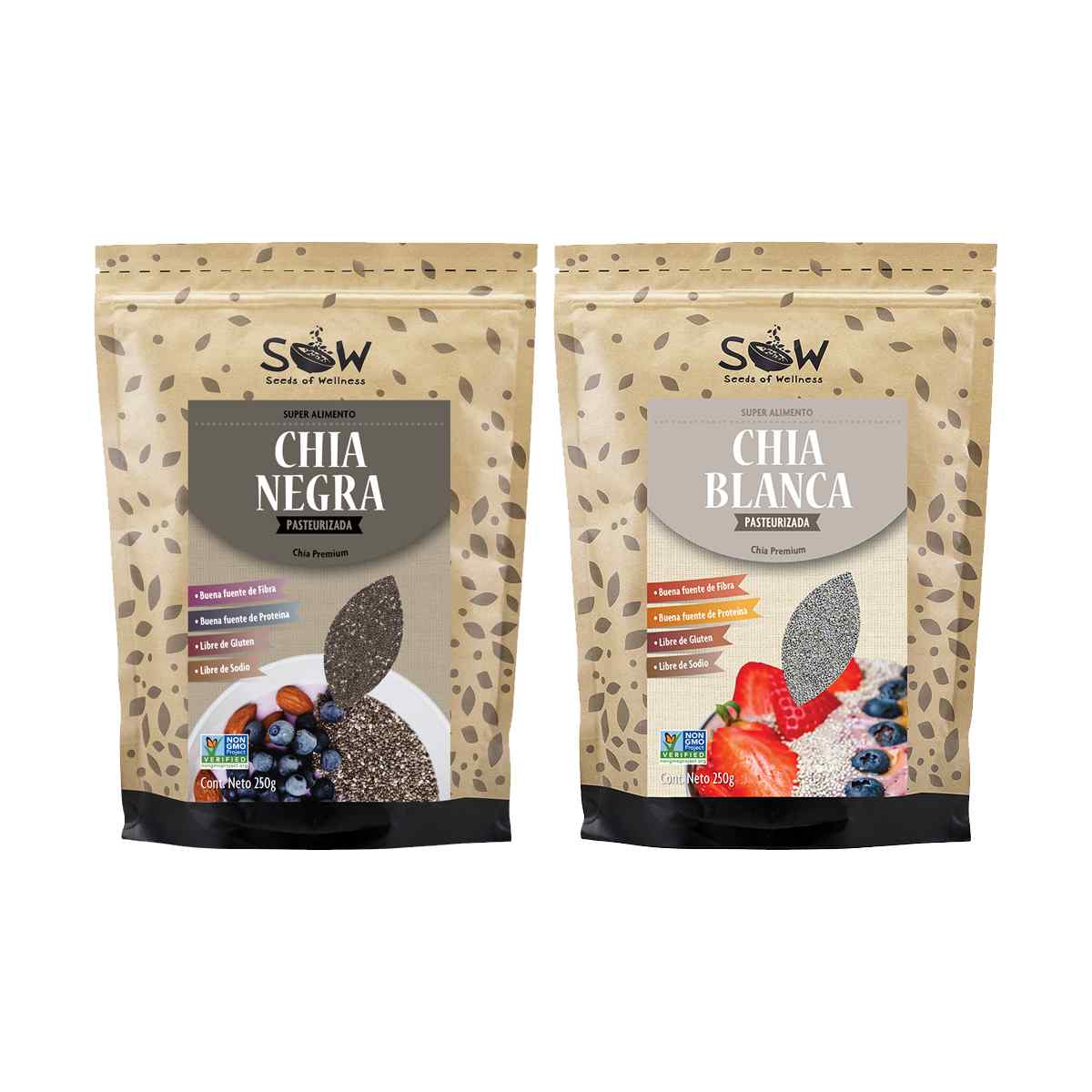 <p>¡Doble potencia! ⚡ Lleva tu bienestar a otro nivel con este <strong>super pack de 1x Semillas Negras de Chía SOW® de 250G y 1x Semillas blancas de Chía SOW® de 250G </strong>¡Un superalimento imprescindible! ✨</p><p>Con <strong>Omega-3 vegano</strong> y <strong>proteína vegetal</strong>. Añade nutrición y sabor a todas tus comidas favoritas. ¡Fácil! 😉</p><p><img style="width: 50px;" src="https://cdn.shopify.com/s/files/1/0029/1730/2321/files/Sellos_Vegano.png?v=1655309793" alt="Sello Vegano" height="50"> <img style="width: 50px;" src="https://cdn.shopify.com/s/files/1/0029/1730/2321/files/Sellos_Libre_de_Gluten.png?v=1655309851" alt="Sello Libre de Gluten" height="50"> <img style="width: 50px;" src="https://cdn.shopify.com/s/files/1/0029/1730/2321/files/Sellos_Keto.png?v=1655906687" alt="Sello Keto" height="50"> <img style="width: 50px;" src="https://cdn.shopify.com/s/files/1/0446/6163/7286/files/non-gmo_7469b048-af58-47c2-8a82-33e724cf83af.png?v=1597098669" alt="Sello Non-GMO" height="37"></p><h3>¿Por qué elegir nuestras Semillas de Chía?</h3><ul><li><strong>Nutrición Completa:</strong> Obtén proteína esencial. ¡Más fibra! Omega-3. Y antioxidantes. Todo lo que tu cuerpo necesita. 💪</li><li><strong>Imprescindibles:</strong> Son versátiles. Úsalas en tus comidas diarias. ¡Un toque crujiente y nutritivo! 🥣</li><li><strong>Pura Calidad:</strong> Libres de gluten. Pureza del 99.98%. ¡Todos los nutrientes directos a ti! ✅</li></ul><p>¡Eleva tu rutina diaria! Siente la diferencia con este superalimento. Tu bienestar te lo agradecerá. ✨</p><details><summary>¡Descubre todos los secretos de la Chía! 👇</summary><hr><h3>Cómo Utilizar</h3><p>¡Aumenta tu energía! ⚡ Las semillas de chía SOW® son un básico. ¡Versátiles y fáciles de usar! Espárcelas sobre yogur. Avena. O granola. Para un toque crujiente. Y nutritivo. ✨</p><p>Mézclalas en tus batidos. Potencia su proteína. Y obtén todos los beneficios del Omega-3 vegano. 🌿 Además, son fuente natural de antioxidantes. ¡Y 100% libres de gluten! Con solo dos cucharadas al día. Nutrirás tu organismo. ¡Óptimo!</p><hr><h3>¡Beneficios para tu Salud!</h3><p>¿Lista para potenciar tu bienestar? ¡Aprende más aquí! 👇</p><ul><li><a href="https://www.sow.cl/blogs/beneficios-b/salud-cardiovascular" target="_blank" rel="noopener"><strong>SALUD CARDIOVASCULAR</strong></a> ❤️</li><li><a href="https://www.sow.cl/blogs/beneficios-b/healthy-aging" target="_blank" rel="noopener"><strong>ANTIOXIDANTE</strong></a> 🛡️</li><li><a href="https://www.sow.cl/blogs/beneficios-b/inmunidad" target="_blank" rel="noopener"><strong>INMUNIDAD</strong></a> ✨</li><li><a href="https://www.sow.cl/blogs/beneficios-a/salud-digestiva" target="_blank" rel="noopener"><strong>SALUD DIGESTIVA</strong></a> 🍎</li><li><a href="https://www.sow.cl/blogs/beneficios-a/libre-de-alergenos" target="_blank" rel="noopener"><strong>LIBRE DE ALÉRGENOS</strong></a> ✅</li><li><a href="https://www.sow.cl/blogs/beneficios-a/anti-inflamatorio" target="_blank" rel="noopener"><strong>ANTI-INFLAMATORIO</strong></a> 🔥➡️💧</li></ul><hr><h3>Ingredientes</h3><p>Semillas de chía negras naturalmente pasteurizadas. Semillas de chía blancas naturalmente pasteurizadas. ¡Lo mejor de ambos mundos! 😉</p></details><details><summary>¡La Tabla Nutricional Completa! 📊</summary><hr><table style="width: 100%; border-collapse: collapse; margin-bottom: 20px;"><thead><tr><th style="text-align: center; padding: 8px; border-bottom: 1px solid #ddd;" colspan="3">Información Nutricional</th></tr><tr><td style="padding: 8px;" colspan="3">Tamaño de Porción: 25 g (dos cucharadas soperas)</td></tr><tr><td style="padding: 8px; border-bottom: 1px solid #ddd;" colspan="3">Porciones por Envase: 10</td></tr><tr><th style="text-align: left; padding: 8px; border-bottom: 1px solid #ddd;"> </th><th style="text-align: right; padding: 8px; border-bottom: 1px solid #ddd;">100 g</th><th style="text-align: right; padding: 8px; border-bottom: 1px solid #ddd;">1 Porción</th></tr></thead><tbody><tr><td style="padding: 8px;">Energía (kcal)</td><td style="text-align: right; padding: 8px;">374</td><td style="text-align: right; padding: 8px;">94</td></tr><tr><td style="padding: 8px;">Proteína (g)</td><td style="text-align: right; padding: 8px;">22.5</td><td style="text-align: right; padding: 8px;">5.6</td></tr><tr><td style="padding: 8px;">Grasa Total (g)</td><td style="text-align: right; padding: 8px;">31.6</td><td style="text-align: right; padding: 8px;">8.0</td></tr><tr><td style="padding: 8px; padding-left: 10px;">Ácidos Grasos</td><td style="text-align: right; padding: 8px;"> </td><td style="text-align: right; padding: 8px;"> </td></tr><tr><td style="padding: 8px; padding-left: 20px;">Saturados (g)</td><td style="text-align: right; padding: 8px;">3.4</td><td style="text-align: right; padding: 8px;">0.9</td></tr><tr><td style="padding: 8px; padding-left: 20px;">Monoinsaturados (g)</td><td style="text-align: right; padding: 8px;">2.3</td><td style="text-align: right; padding: 8px;">0.6</td></tr><tr><td style="padding: 8px; padding-left: 20px;">Poliinsaturados (g)</td><td style="text-align: right; padding: 8px;">26</td><td style="text-align: right; padding: 8px;">6.5</td></tr><tr><td style="padding: 8px; padding-left: 30px;">Omega-3 (Alfa-Linolénico) (g)</td><td style="text-align: right; padding: 8px;">20</td><td style="text-align: right; padding: 8px;">5.0</td></tr><tr><td style="padding: 8px; padding-left: 30px;">Omega-6 (Linoléico) (g)</td><td style="text-align: right; padding: 8px;">6.0</td><td style="text-align: right; padding: 8px;">1.5</td></tr><tr><td style="padding: 8px;">Ácidos Grasos Trans (g)</td><td style="text-align: right; padding: 8px;">0.0</td><td style="text-align: right; padding: 8px;">0.0</td></tr><tr><td style="padding: 8px;">Colesterol (mg)</td><td style="text-align: right; padding: 8px;">0.0</td><td style="text-align: ri