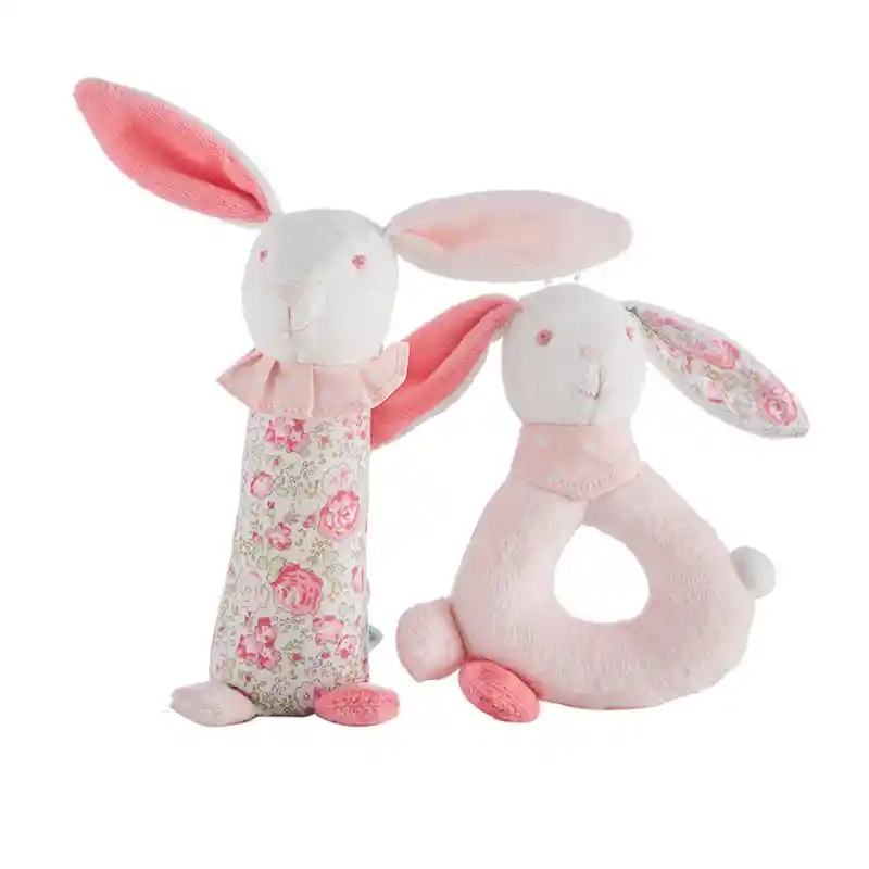 Este Diseño con Coneja es una tentación irresitible. La tela Rosada de Flores lo hace un clásico. Tiene un lindo pañuelo colagado al cuello. Es un pack de dos sonajeros para tu bebé están hechos en 100% Algodón y un suave y exquisito peluche Rosado. Además cuando lo mueves suena un cascabel dentro de él, que también lo hace muy divertido. Tiene detalles muy lindos y casuales que lo hacen muy lindo en su simpleza.