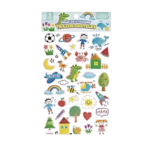 Stickers Trazos pasteles, incluye: Lámina de stickers en colores pasteles y con efecto de trazos a mano alzada. Diseño aleatorio