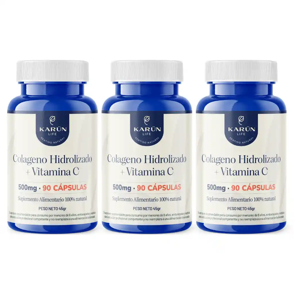 Colágeno Hidrolizado + Vitamina C 90 Cápsulas 500 Mg Cada cápsula de Colágeno Hidrolizado + Vitamina C contiene 400mg de Colágeno y 50mg de Vitamina C. MODO DE USO: 2 Capsulas al dia. El colágeno Hidrolizado es una proteína muy abundante que está presente en todos los órganos y tejidos de nuestro cuerpo. Es esencial para el desarrollo y protección de músculos, tendones, la piel, ligamentos, huesos, córnea, encías, dientes, uñas, etc. La molécula de colágeno está formada por 3 cadenas de aminoácidos con forma de una hélice triple. Este ordenamiento da origen a las fibras de colágeno. La deficiencia de esta proteína se traduce en un envejecimiento prematuro de la piel (pérdida de la tersura, arrugas), pérdida de flexibilidad de los tejidos, dolores articulares y musculares. También un daño severo en cartílagos, especialmente el cartílago articular. La vitamina C es una vitamina hidrosoluble que se caracteriza por su potente acción antioxidante que previene el envejecimiento celular, estimula el sistema inmunológico, previene y disminuye estados gripales y alérgicos. Además tiene función cicatrizante celular, participa también en la formación del colágeno de la piel, tendones y ligamentos. BENEFICIOS: - Ayuda a la elasticidad de la piel reafirmándola y disminuyendo arrugas. - Ayuda a reparar y regenerar los ligamentos, cartílagos, tendones, articulaciones, huesos y la rigidez en las articulaciones. - Aumenta la fabricación de colágeno del cuerpo. Efecto causado por la vitamina C. - Estabiliza el sistema inmunológico mejorando la salud. - Mejora la captación del hierro en nuestro organismo.