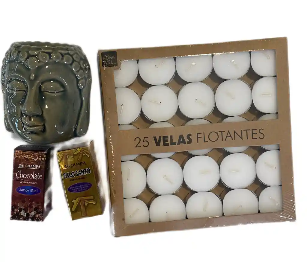 Pack de Regalo Difusor Buda + 2 esencias + 25 velas Ultra duracion