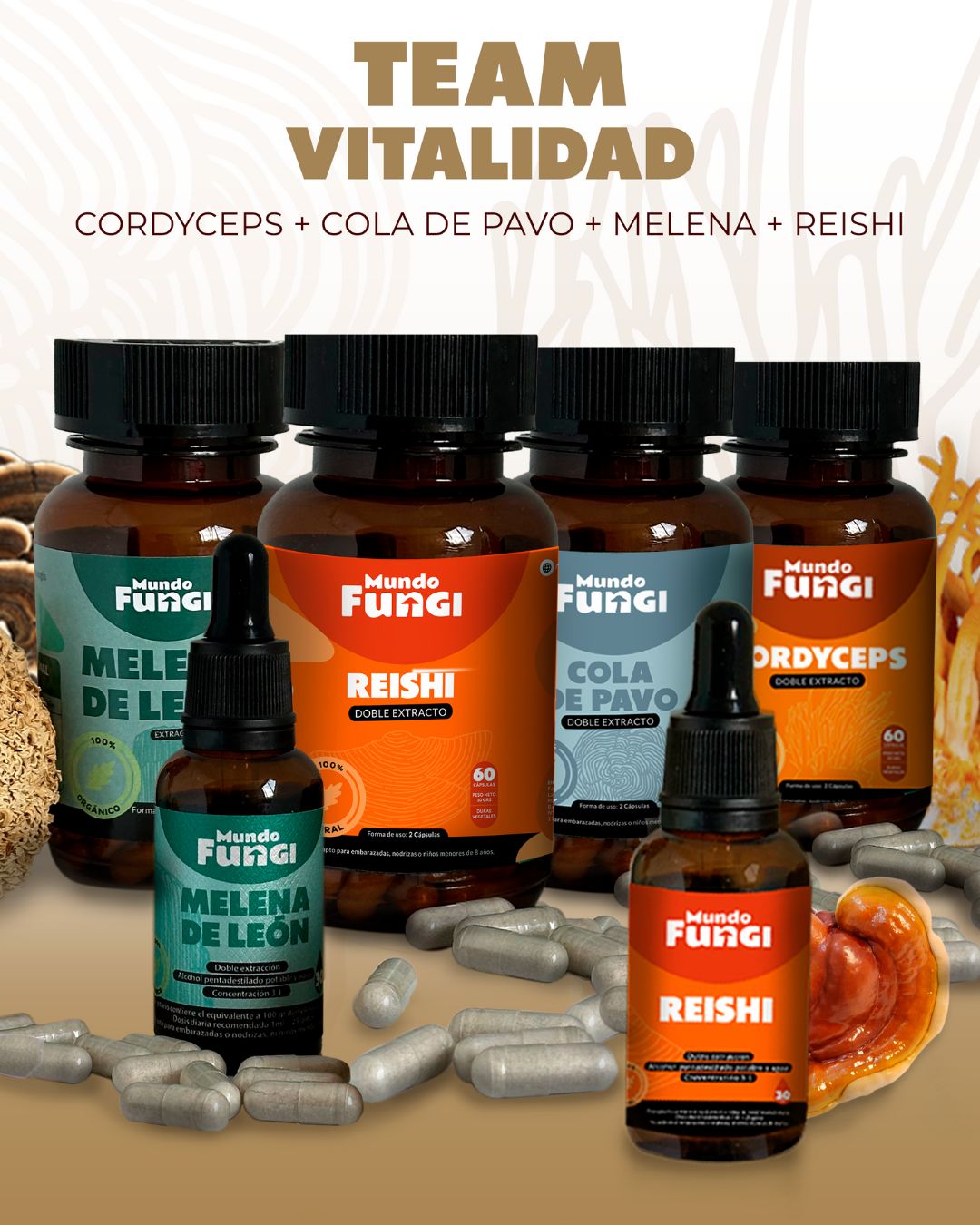 <p><strong>Melena (caps + gotas) Reishi Caps (caps+gotas) + Cordyceps caps + Cola de</strong><br><strong>pavo caps.</strong></p> <p><br>Apoya todas las aristas de tu ser y logra una simbiosis entre la mente, el cuerpo,<br>Sus energías y herramientas.<br><strong>Melena y Reishi, </strong>una combinación que nutre el eje intestino-cerebro para una mayor claridad mental y mejores estados de ánimo. Mejora tu nutrición con decenas.<br>de Beta-glucanos y permite que herramientas de la naturaleza como el<br><strong>Cola de pavo y el Cordyceps</strong> limpian tu cuerpo y aumentan su energía.</p> <p><!----></p>