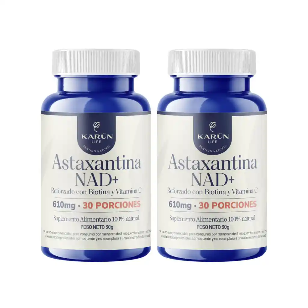Pack Doble Astaxantina NAD+ – Belleza, Energía Celular y Protección Antioxidante Extendida Potencia tu rutina de bienestar con el Pack Doble Astaxantina NAD+, una fórmula avanzada que combina astaxantina, NAD+, biotina y vitamina C para brindarte un cuidado prolongado desde el interior. Ideal para quienes buscan fortalecer su piel, cabello y uñas, apoyar la energía celular y reforzar su defensa antioxidante con una suplementación constante. ¿Qué incluye este pack? 2 frascos de Astaxantina NAD+ (60 cápsulas cada uno – 2 meses de uso) ¿Qué aporta cada porción (2 cápsulas)? Astaxantina: 8 mg NAD+ (Nicotinamida Adenina Dinucleótido): 500 mg Biotina (Vitamina B7): 300 µg (100% del valor diario recomendado) Vitamina C: 100 mg (166% del valor diario recomendado) Beneficios clave: -Aporta una potente acción antioxidante que ayuda a proteger las células del envejecimiento prematuro.* -Favorece una piel más saludable y radiante, además de fortalecer el cabello y las uñas.* -Contribuye a la producción natural de colágeno gracias a la acción de la vitamina C.* -Promueve la energía celular y el metabolismo gracias al aporte de NAD+.* -Refuerza el sistema inmunológico y ayuda a reducir el impacto del estrés oxidativo diario.* Modo de uso recomendado: Tomar 2 cápsulas al día, preferentemente una en la mañana y otra al mediodía junto con alimentos. Ejemplo de consumo: 1 cápsula con el desayuno y 1 con el almuerzo. Se recomienda un uso continuo entre 3 a 5 meses para obtener mejores resultados. Ideal para quienes buscan: Cuidar su piel, cabello y uñas desde dentro. Apoyar su energía celular y su metabolismo de forma natural. Reforzar su sistema inmune con antioxidantes clave. Un suplemento completo para belleza, longevidad y vitalidad. Por qué elegir el Pack Doble Astaxantina NAD+: Fórmula vegana, sin azúcar, sin gluten y Non GMO. Fabricado en Chile, con envase reciclable. Suplementación extendida para 60 días de uso continuo. Advertencias: Este suplemento no reemplaza una alimentación equilibrada. No es un medicamento y no previene, trata ni revierte enfermedades. No recomendado para niños menores de 8 años, embarazadas o personas con condiciones médicas preexistentes sin indicación médica. Mantener en un lugar fresco y seco, fuera del alcance de los niños. Astaxantina NAD+: tu aliado diario para belleza natural, energía celular y protección antioxidante profunda.