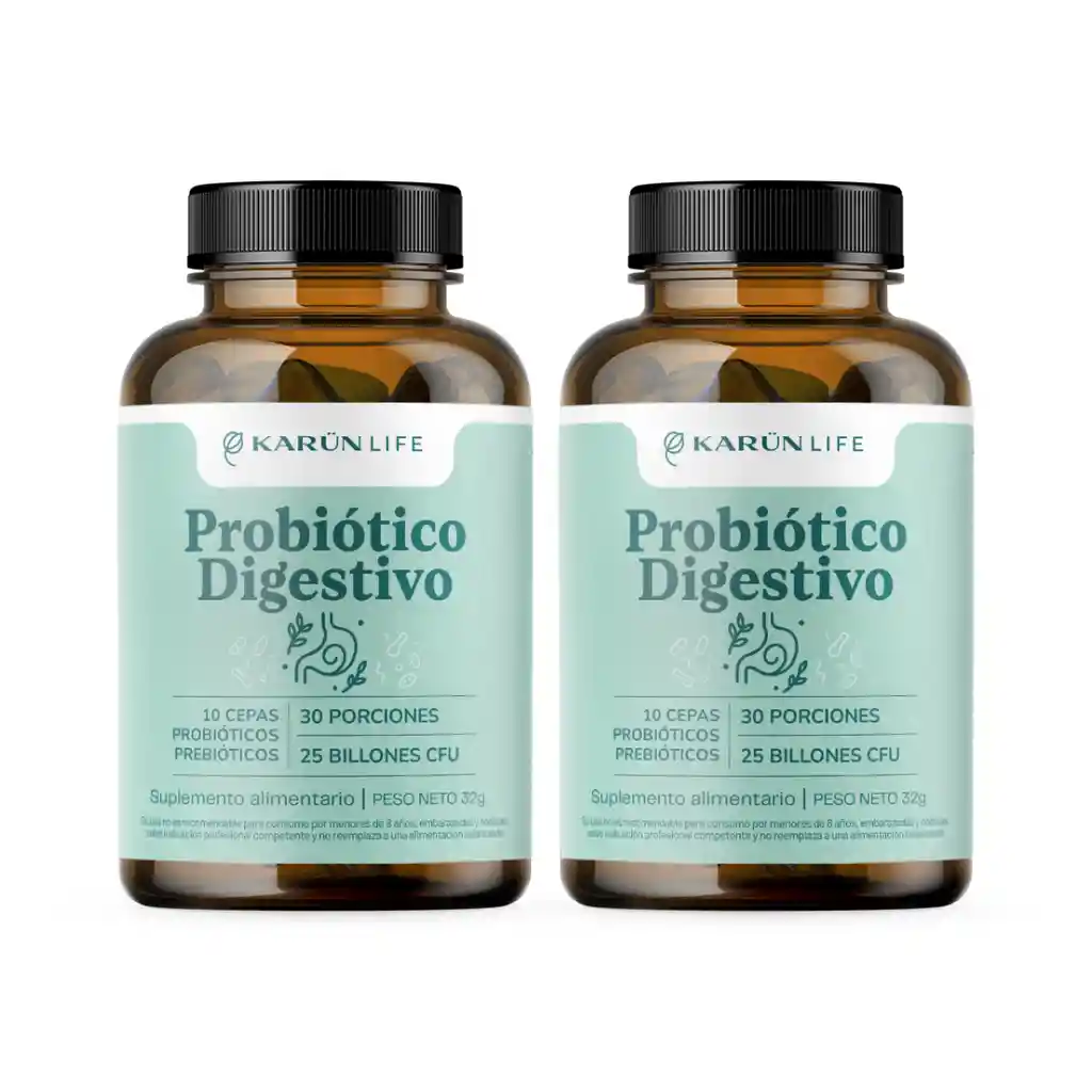 Pack Doble Probiótico Digestivo – Equilibrio Intestinal y Defensa Inmune por 2 Meses Fortalece tu salud digestiva e inmunológica con el Pack Doble Probiótico Digestivo, una fórmula avanzada que aporta equilibrio desde el intestino. Ideal para quienes buscan mantener una microbiota sana, mejorar su digestión diaria y reforzar sus defensas naturales de forma continua y efectiva. ¿Qué incluye este pack? 2 frascos de Probiótico Digestivo (60 cápsulas cada uno – 60 porciones en total) ¿Qué aporta este suplemento? Cada porción diaria contiene 25 billones de probióticos con 11 cepas activas, además de inulina como prebiótico: Inulina (prebiótico) Lactobacillus Johnsonii Lactobacillus Rhamnosus Lactobacillus Bulgaricus Lactobacillus Acidophilus Lactobacillus Casei Lactobacillus Reuteri Bifidobacterium Lactis Bifidobacterium Longum Streptococcus Thermophilus Bacillus Coagulans Beneficios clave: -Contribuye al equilibrio del microbioma intestinal y mejora la absorción de nutrientes.* -Refuerza las defensas naturales desde el sistema digestivo.* -Ayuda a reducir la hinchazón, gases y malestares estomacales recurrentes.* -Proporciona bienestar general gracias a su alta concentración de cepas probióticas.* Modo de uso recomendado: Tomar 2 cápsulas al día con abundante agua. Ejemplo de consumo: 1 cápsula con el desayuno y otra con el almuerzo. Ideal para quienes buscan: Mejorar su digestión de forma natural. Fortalecer su sistema inmune desde el intestino. Mantener una flora intestinal equilibrada. Apoyar su bienestar general día a día. Advertencias: Este suplemento no reemplaza una alimentación equilibrada. No es un medicamento y no previene, trata ni revierte enfermedades. No recomendado para niños menores de 8 años, embarazadas o personas con condiciones médicas preexistentes sin indicación médica. Mantener en un lugar fresco y seco, fuera del alcance de los niños. Siente tu digestión en equilibrio y tu cuerpo en armonía por más tiempo con el Pack Doble Probiótico Digestivo.