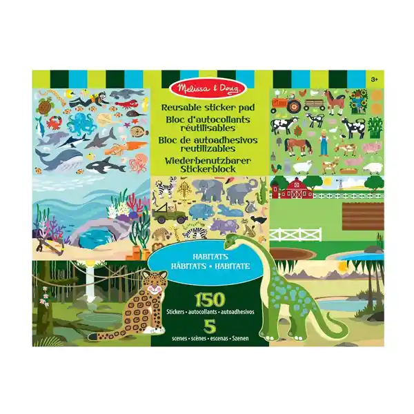 Diseñado para niños a partir de 3 años, este bloc de stickers reutilizables incluye 5 coloridos fondos extraíbles inspirados en hábitats naturales, como un oasis en el desierto, un paisaje prehistórico, una granja, una jungla y un mar azul profundo. Con más de 150 pegatinas reposicionables, los niños pueden crear y recrear escenas mientras desarrollan habilidades motoras finas y fomentan su creatividad. Contribuye a la concentración y la atención al detalle mientras los niños completan sus diseños. 📏 Medidas del producto en su empaque 28 cm (alto) x 36 cm (frente) x 1 cm (fondo)