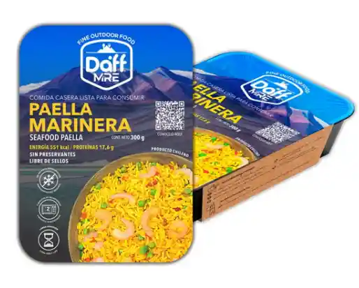 Paella marinera en formato de Bandeja Individual de 350 Grs. De fácil transporte y practica manipulación al momento de servir, debido a su nuevo formato de bandeja que evita el derrame de alimento entregándote una experiencia de mayor comodidad. No requiere refrigeración, es de larga duración y muy fácil de calentar. Opciones para Calentar: Microondas (2 minutos) Baño María. Horno Combinado Automático Eléctrico a 125°C (20 minutos) Calentador Autónomo Daff. (10-12 minutos) Información Nutricional: