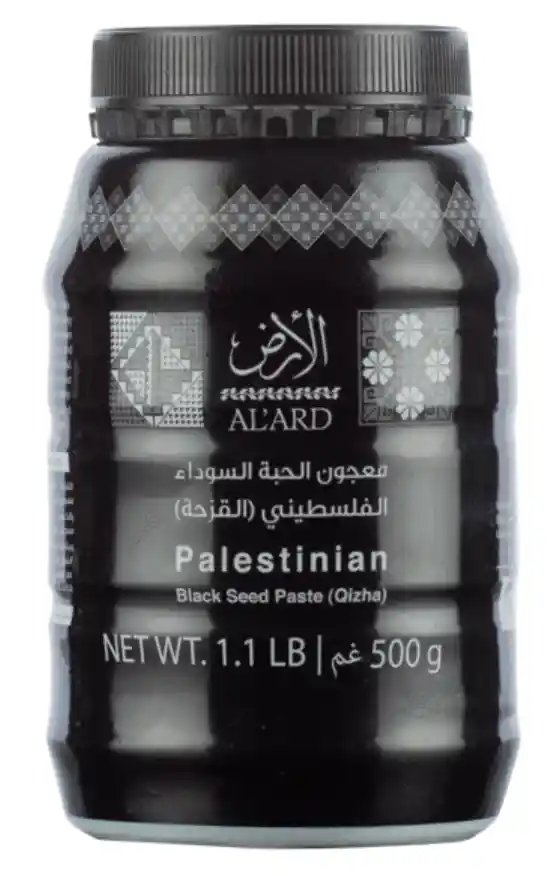 MEZCLA DE SEMILLA NEGRA PALESTINA (QIZHA) Una tradicional mezcla de pasta de semillas de comino y pasta de semilla de sésamo (Tahine) que resulta en un acompañamiento delicioso y con innumerables beneficios para la salud. Es muy utilizado en medio oriente y África como una salsa dulce una vez mezclado con miel, syrup o azúcar. Puede ser añadido también a mezclas de queques y pasteles para darles un sabor asombroso. Directo de Palestina Cosechados y producidos a mano