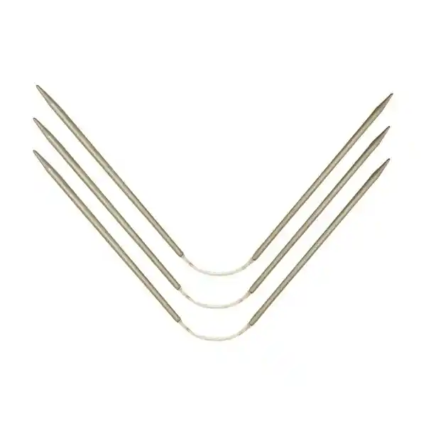 ¡Tejer calcetines nunca fue tan fácil! ¿Por qué usar 5 cuando puedes usar 3? Fabricados en aluminio de alta calidad, cada set contiene 3 agujas de doble punta y cada aguja un cordon intermedio para otorgarle gran flexibildad. El set es ideal para tejer en circular (sin costuras). Puedes hacer calcetines, guantes, gorros, o incluso las piezas de diámetro pequeño pueden ser tejidas con mucha facilidad. Para tejer en redondo los puntos se distribuyen en dos agujas y la tercera aguja se usa para tejer, lo que significa que solo hay dos cambios de aguja por fila. ¡Anímate a descubrir esta nueva e inovadora forma de crear tus proyectos! Medidas: 2.00 - 2.50 - 3.00 - 3.50 - 4.00 - 4.50 - 5.00 - 5.50 mm.