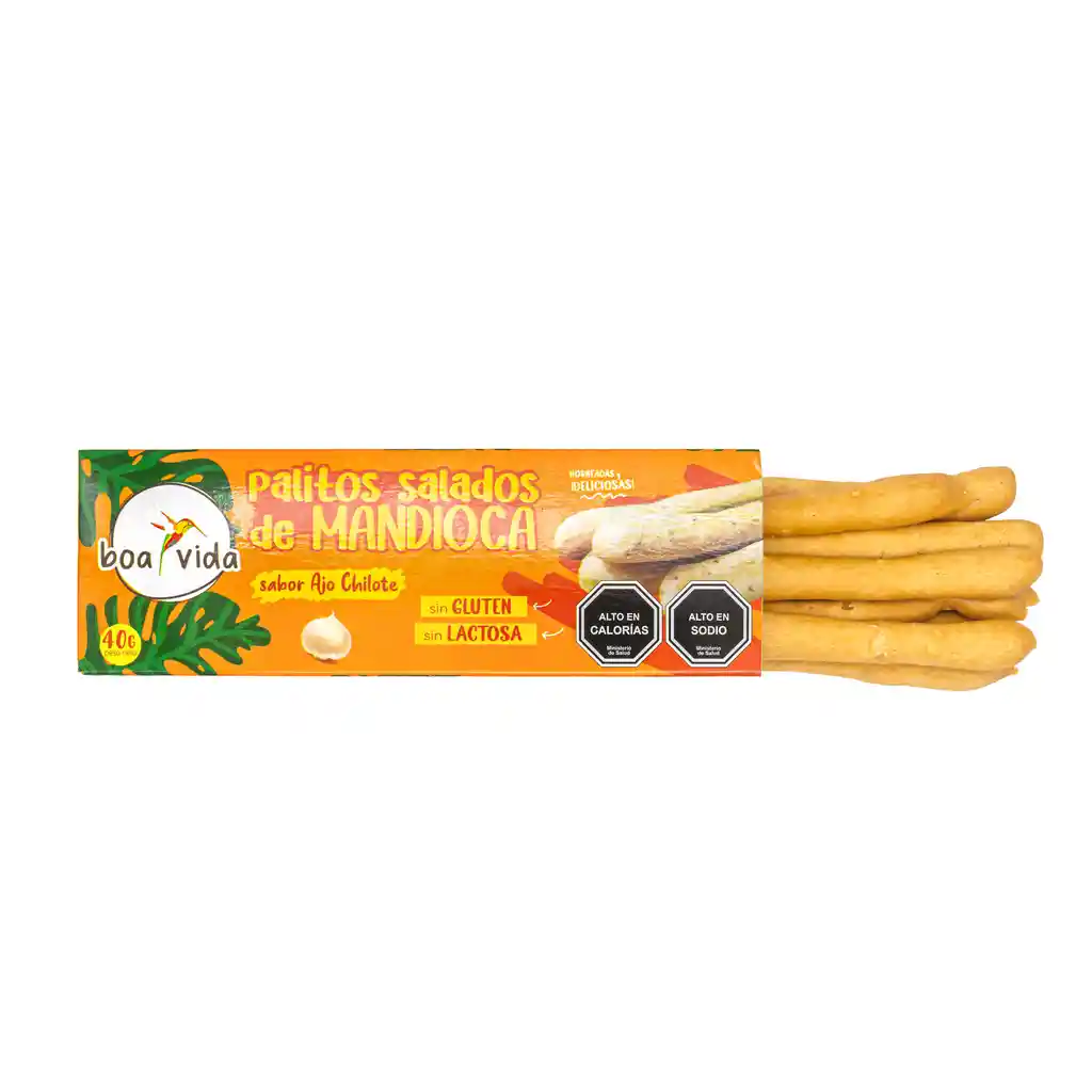 Snack salado y horneado en forma de bastones o palitos, libre de gluten y de lactosa (contiene leche descremada sin lactosa) ideal para picoteos y colaciones, se puede consumir sola o acompañada con tu salsa favorita, tiene ajo chilote fresco triturado que dan un toque especial, más suave que el ajo tradicional pero igualmente muy sabroso, Puede consumirse solo o acompañado de tu salsa preferida.