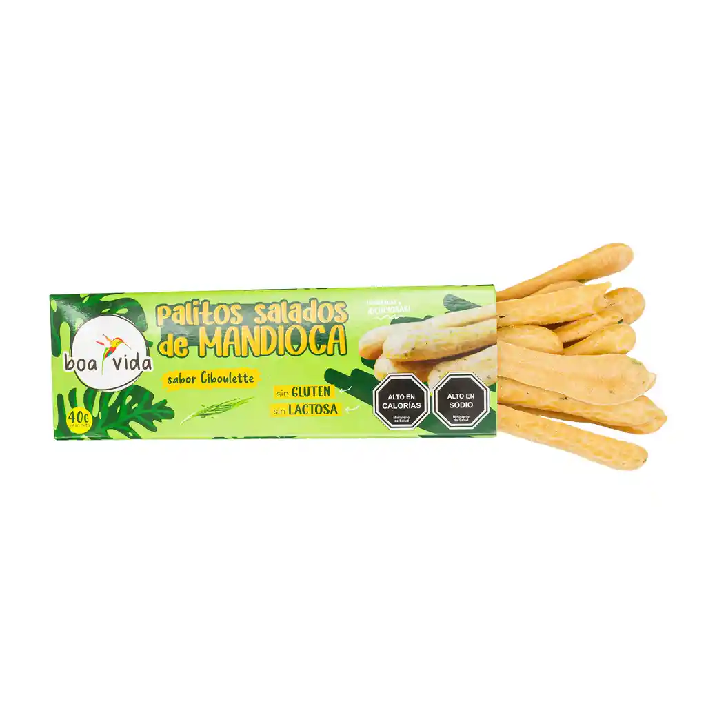 Snack salado y horneado en forma de bastones o palitos, libre de gluten y de lactosa (contiene leche descremada sin lactosa) ideal para picoteos y colaciones, se puede consumir sola o acompañada con tu salsa favorita, tiene ciboulette fresco picado que dan un toque especial, Puede consumirse solo o acompañado de tu salsa preferida.