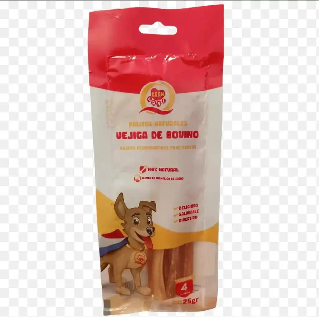 Proporciona a tu perro un delicioso y saludable snack con los palitos de vejiga de bovino Gran Cani. Perfectos para todas las razas y tamaños, son una opción natural y nutritiva para consentir a tu mascota. Características principales 100% natural: elaborado con vejiga de bovino deshidratada. Alto en proteínas: ideal para mantener músculos fuertes. Textura firme: ayuda a la limpieza dental de tu perro. Apto para todas las edades y tamaños. Beneficios Estos snacks no solo son deliciosos, sino que también aportan beneficios a la salud de tu perro, ayudando a: Reducir el sarro y mantener dientes más limpios. Proveer una fuente de entretenimiento saludable. Satisfacer la necesidad de masticar en perros jóvenes y adultos.