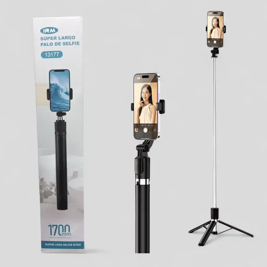 Palo selfie extensible hasta 1,70 m con control remoto Bluetooth y base tipo trípode. Compatible con Android y iPhone, ideal para fotos y videos estables. Diseño plegable, liviano y fácil de transportar.