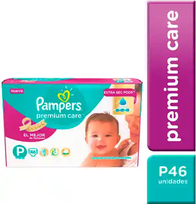 Pañal Desechable Pampers Premium Care P 46 U. Mientras está acostado boca arriba levanta las piernas de tu bebé cuidadosamente tomándolo de los tobillos y desliza el pañal nuevo por debajo de la cola cuidando de poner la parte delantera mirando hacia el frente. Cierra el pañal con las cintas reajustables de forma tal que no le quede ni muy suelto ni muy ajustado.Cod : 19686