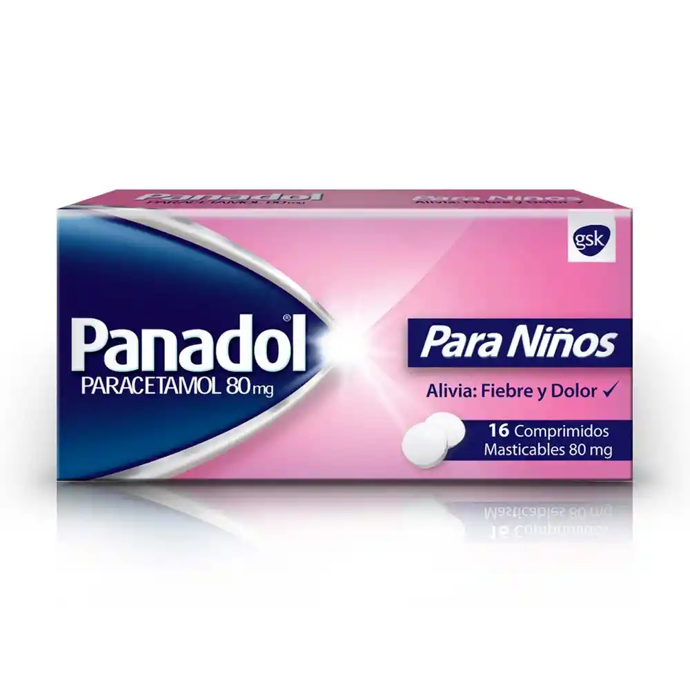 Principio Activo: Paracetamol / Forma Farmacéutica: Comprimidos Masticables / Dosis Por Forma Farmacéutica: 80 mg. ¿Para Qué Enfermedades o Condiciones se Prescribe Este Medicamento? Este Medicamento se Usa Para Tratar la Fiebre y Los Dolores Suaves a Moderados. Este Medicamento Provee Alivio Temporal a Los Síntomas Descritos, Pero en Ningún Caso Resuelve el Origen de Ellos. ¿Cómo Debo Usar Este Producto? (Posología) Vía Oral, el Comprimido Puede Tomarse Con Agua o Jugo. La Dosis a Administrar en Niños es Por Kilo de Peso Corporal, 10 a 15 mg Por Kilo de Peso, la Que Debe Ser Administrada Hasta 4 Veces al Día, Con Una Dosis Máxima Diaria de 60 mg Por Kilo de Peso, no se Deben Sobrepasar Las Dosis Máximas Diarias (En 24 Horas). – 2 a 4 Años: Dosis Máxima Diaria 720 mg. – 4 a 6 Años: Dosis Máxima Diaria 960 mg. – 6 a 9 Años: Dosis Máxima Diaria 1.260 mg. – 9 a 11 Años: Dosis Máxima Diaria 1.740 mg. – 11 a 12 Años: Dosis Máxima Diaria 2.160 mg. Las Dosis a Menores de 2 Años Deben Ser Consultadas al Médico. Presentación Panadol Niños Viene en Formato de Comprimidos Masticables, la Caja Contiene 16 Unidades. Condiciones de Almacenamiento Mantener en su Envase Original, Protegido Del Calor, Humedad y Fuera Del Alcance de Los Niños. No Use Este Producto Después de la Fecha de Vencimiento Indicada en el Envase. Principio Activo (Nombre Genérico) Paracetamol. Advertencias de Uso no Administrar Por Más de 5 Días en Caso de Dolor, Por Más de 3 Días en Caso de Fiebre, o Por Más de 2 Días en Caso de Dolor de Garganta, Sin Consultar al Médico. El Uso Prolongado y de Altas Dosis de Paracetamol, Puede Provocar Severo Daño Hepático. Como Todo Medicamento, Manténgase Fuera Del Alcance de Los Niños. No Sobrepasar Las Dosis Recomendadas. La Administración de Medicamentos a Los Niños Debe Hacerla un Adulto Responsable. Paracetamol es un Medicamento Que se Encuentra Solo o en Combinación Con Otros Principios Activos, en Productos Destinados al Tratamiento de Resfrío, Tos, Alergia, Entre Otros. Algunos de Estos Productos Pueden Venderse Libremente y Otros Requieren Receta Médica. Paracetamol Puede Causar, Aunque Con Poca Frecuencia, Reacciones Graves a la Piel, Que Pueden Manifestarse Con Enrojecimiento, Erupción Cutánea, Ampollas y Daños en la Superficie de la Piel. Si Usted Desarrolla Erupción Cutánea u Otra Reacción a la Piel Mientras Usa Paracetamol, Deje de Tomarlo y Acuda al Médico Inmediatamente. Si ya ha Tenido Reacciones a la Piel Con Paracetamol, no Tome Medicamentos Que lo Contengan. Paracetamol Puede Causar, en Dosis Superiores a Las Habituales, Graves Daños al Hígado, Que se Pueden Manifestar Con Síntomas Como Fatiga Inusual, Anorexia, Náuseas y/o Vómitos, Dolor Abdominal, Ictericia (Coloración Amarilla de Piel y/o de la Zona Blanca de Los Ojos), Orina Oscura o Deposiciones Blanquecinas. En Caso de Presentar Alguno de Estos Síntomas, Suspenda el Uso Del Medicamento y Acuda al Médico. Es Importante Mantener Este Medicamento Lejos Del Alcance de Los Niños y de Personas Con Tendencias Suicidas y Acudir Por Ayuda Médica Inmediatamente si se ha Ingerido Una Cantidad Significativamente Superior a la Habitual (El Doble de la Dosis Diaria Normal o Más). Dosificación Cada Comprimido Masticable Tiene Una Concentración de 80 mg. Reacciones Adversas Los Medicamentos Pueden Producir Algunos Efectos no Deseados Además de Los Que se Pretende Obtener. Algunos de Estos Efectos Pueden Requerir Atención Médica. Consulte Inmediatamente al Médico si el Menor Presenta Algunos de Los Siguientes Síntomas: – Ojos o Piel Amarilla, Nauseas, Vómitos. – Dificultad Para Respirar, Sudoración, Orina Coloreada o Turbia. – Manchas o Prurito (Picazón) o Moretones en la Piel. – Palidez o Debilidad. – Dolor de Tipo Renal. – Disminución de la Cantidad de Orina. – Orina Oscura o Con Sangre. – Sangramiento Inusual, Deposiciones Negras Alquitranadas o Con Sangre. Cualquier Otra Reacción no Mencionada Que Ud. Considere Extraña, Importante o Molesta en el Niño. Pueden Ocurrir Otros Efectos no Deseados Que Usualmente no Requieren Atención Médica y Que Desaparecen Con el Uso (Adaptación Del Organismo al Medicamento). No Obstante si Continúan o se Intensifican Debe Comunicarlo a su Médico. Contraindicaciones si su Médico no ha Dispuesto Otra Cosa, no se Debe Administrar Este Medicamento en Las Siguientes Condiciones: – Hepatitis, Daño Hepático o Renal Severo. – Alergia al Paracetamol, AAs o a Algún Componente de la Fórmula. – Una Administración Repetida Está Contraindicada en Pacientes Con Anemia, Enfermedad Cardíaca o Pulmonar Grave. Condición de Venta Venta Libre.