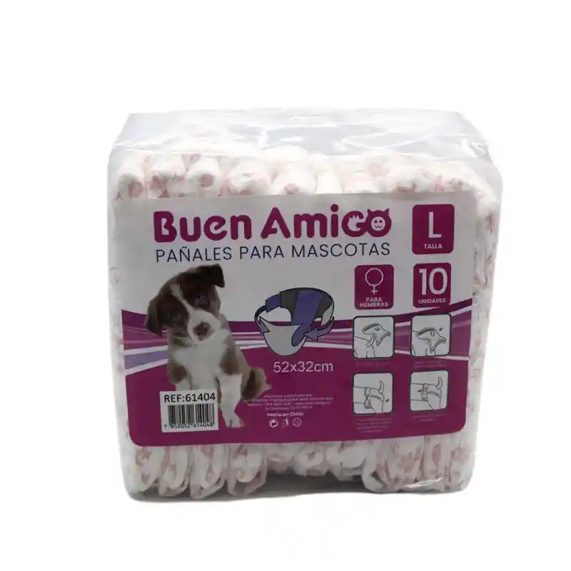 . Pañal para celo, con forma anatómica, con manta super absorbente con gel para largo tiempo de absorción. . Indicado para perritas con incontinencia urinaria, postoperatorios, paseos , celo viajes largos y demarcación de territorios. . Poseen cierres adhesivos en los laterales para asegurar una correcta fijación. Ajustable a la cintura. . Cuenta con la misma tecnología que los pañales utilizados en bebés. Especificaciones: . Marca: Buen Amigo. . Genero: Hembra. . Talla: L (52 x 32 cm) Peso aprox de la mascota entre 11 a 16 kg) . Contenido: Paquete con 10 unidades.
