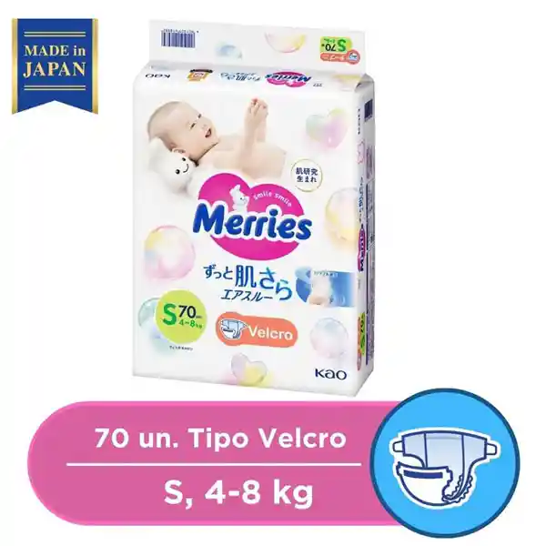 Pañal premium Merries con tipo velcro cuenta con una excelente absorción, atrapando y absorbiendo instantáneamente. Cuentan con una nueva tecnología de malla ondulada para asegurar la comodidad y protección de tu bebé Características: Excelente ventilación Suave con la piel Protector de filtración Excelente absorción Superficie ultra suave y esponjosa que trata con suavidad la delicada piel del bebé Cierres con cintas tipo velcro suaves y reutilizables Indicador de humedad que cambia de color Talla S de 70 unidades cada paquete Peso recomendado: 4 – 8 Kg