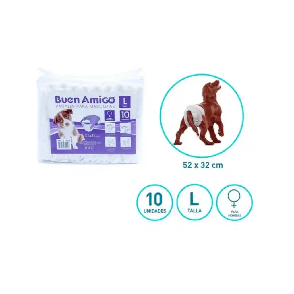 Los pañales desechables para perros hembra talla L son la solución ideal para mantener la higiene de tu mascota durante el celo, evitando manchas y manteniendo los espacios limpios. Están diseñados para ofrecer alta absorción, comodidad y ajuste seguro, permitiendo que tu perro se mueva con libertad sin perder protección. Son fáciles de colocar y retirar, brindando tranquilidad tanto a la mascota como a sus dueños durante esta etapa. Gracias a su diseño práctico y confiable, estos pañales ayudan a que los días de celo sean más cómodos y llevaderos, manteniendo la limpieza del hogar sin complicaciones. ✅ Características Género: Hembra Talla: L Medidas: 52 x 32 cm Peso recomendado de la mascota: 10 a 15 kg Contenido: 10 unidades Alta capacidad de absorción Ajuste cómodo y seguro Desechables Uso durante el celo