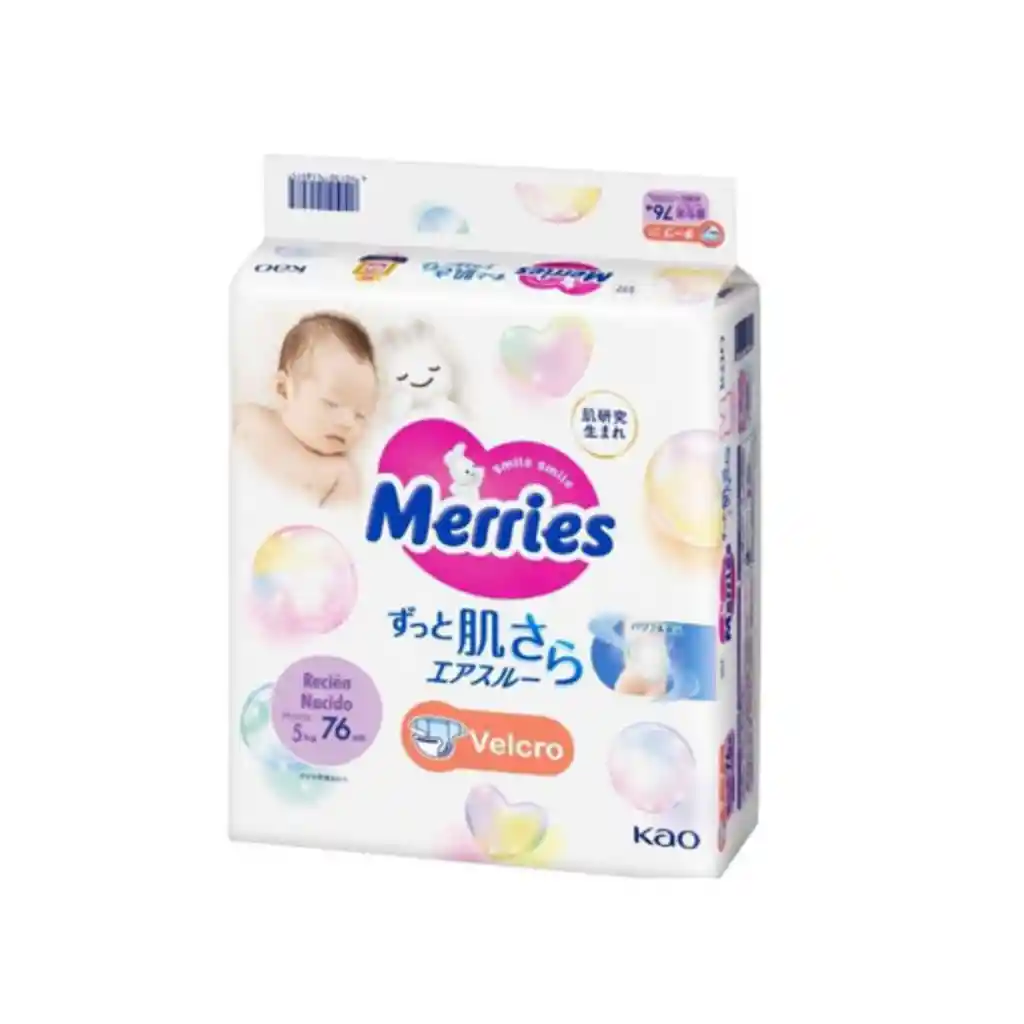 Pañales Merries Velcro RN 76 Pcs Super Jumbo. Características: ¡Con Merries, tu guagua se mantendrá seca por más tiempo! Gracias a su tecnología, la humedad se expulsa a través de las 3 capas de ventilación, permitiendo que tu guagua se mantenga seca en todo momento y su piel no sufrirá irritación. A su vez, retiene la orina y el popó gracias a su gran poder de absorción. ¡Disfruta de sus beneficios en formato velcro y pants! Pañales premium con tecnología japonesa. Su textura es muy suave con la piel. Protege de filtraciones. Posee una excelente absorción. Posee indicador de cambio. Sus velcros son reutilizables.