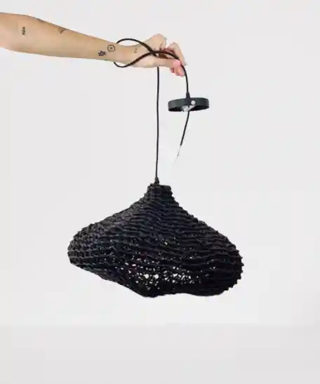 Pantalla de malla de fibra color negra, diseño tejido. Modelo gota. Medidas aproximadas de la pantalla: 37 cm de ancho x 27 cm de alto, el diseño es moldeable. Opcional: Puedes comprar el Sistema eléctrico adicional, de cordón negro de 90 cm regulable, y cierre metálico al techo. Soquete grafito E27.