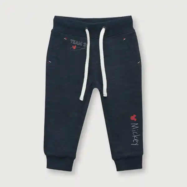 Pantalón de Buzo Mickey en Color Azul Con Elástico y Cordón en Pretina Más Puño. Estampado de Frases en Pierna y Bolsillo.