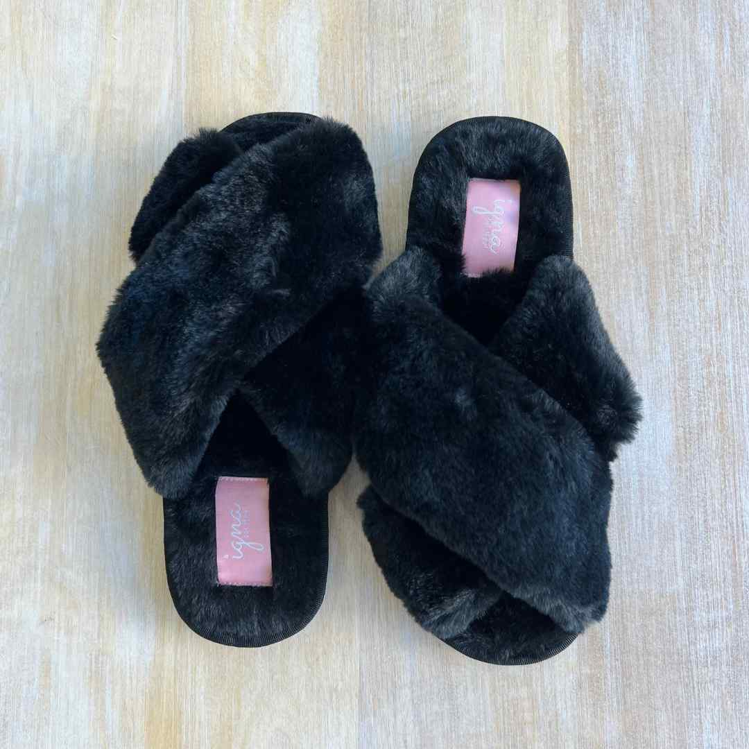 Estilosas Pantuflas abiertas, con bandas cruzadas. Negras. (Tallas S 24 cms)