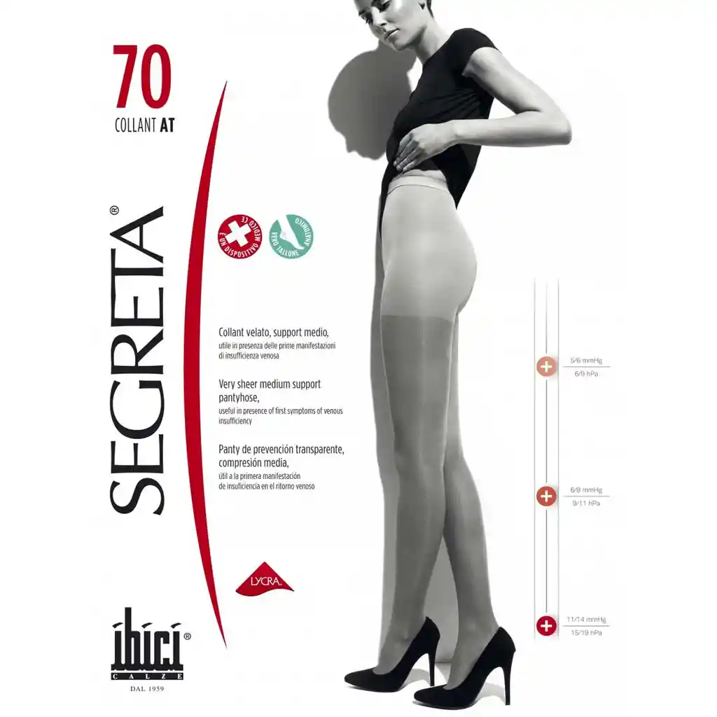 <h2>Panty Preventiva Varices 70 Den</h2>Panty prevención 70 Denier Compresión graduada 11/14 mmHg a nivel de tobillo que favorece el buen funcionamiento del retorno venoso.<br /><br />Malla en Red<br />Soporte medio transparente. <br /><br />INDICACIONES DE USO<br /><br />Aconsejable en presencia de hinchazón en los tobillos y en las primeras manifestaciones de insuficiencia venosa, muy aconsejable su uso a modo preventivo.<br /><br />Posee braga reductora y contentiva en su modelo panty.<br /><br />PRIMER USO<br /><br />1.Es clave usar el producto al comenzar el día, en la ducha refresque sus piernas con agua fría y luego, antes de cualquier actividad física, comience a usar el producto.<br /><br />2. La primera semana utilice nuestra terapia de compresión sólo 3 a 4 horas, esto también ayudará a acostumbrarse a ella. Aumente el uso en 2 horas cada semana hasta alcanzar<br />el periodo de tiempo de un día completo de uso. Para líneas 70-120-140<br /><br />3. Una vez que la terapia de compresión sea parte de su vida cotidiana, aumente a un nuevo nivel de compresión en caso de que sea necesario.<br /><br />4. En verano, debido a las altas temperaturas, los problemas de retorno venoso se agravan, por ello médicamente está recomendado el uso de esta terapia durante las 4 estaciones del año.<br /><br />CONSEJOS<br />DE CUIDADO<br /><br />1. Lavado agua fría, máximo a una temperatura de 30 °C.<br />2. Utilice un jabón suave, especial para ropa delicada o detergente líquido para este tipo de prendas.<br />3. Lave cada prenda por separado y no la mezcle con ropa de otros colores.<br />4. No frote entre partes de la prenda, ni contra ninguna superficie dura.<br />5. Cuidado de no dejar en ellas residuos de jabón.<br />6. Este tipo de ropa no debe retorcerse porque puede perder forma. <br />7. IMPORTANTE: no lavar en máquina ni usar secadora. No secar bajo el sol.