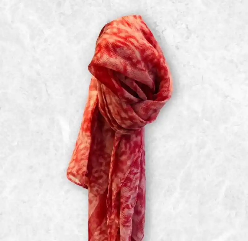 Pañuelo tipo batik estampado en tonos rojos, suave y ligero. Grande. Textura: delgado y liso.