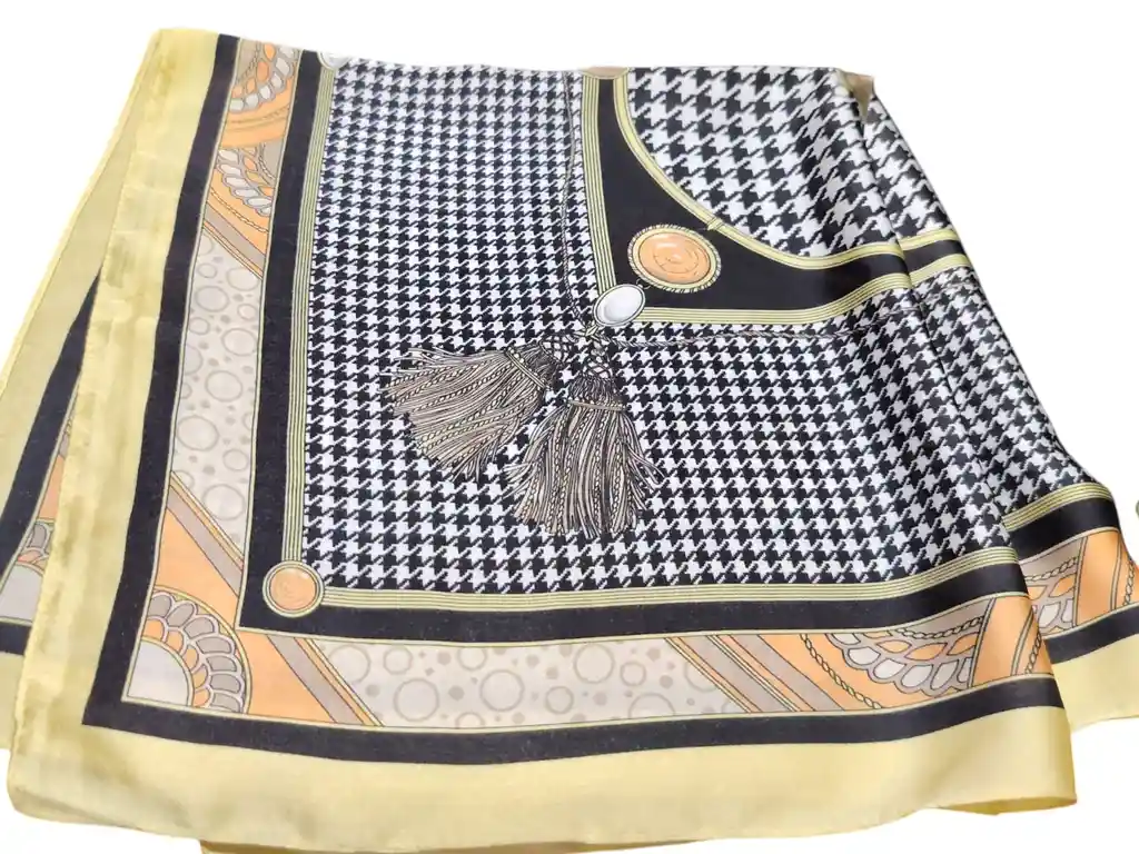 Pañuelo de diseño clásico en blanco y negro, con una trama gráfica atemporal que transmite elegancia y sofisticación. Sus detalles dorados y borlas decorativas aportan un toque distintivo y refinado, convirtiéndolo en un accesorio versátil que eleva cualquier look, tanto de día como de noche. Ideal para quienes buscan estilo, carácter y un acabado premium en cada detalle. Medidas: 70 x 70 cm