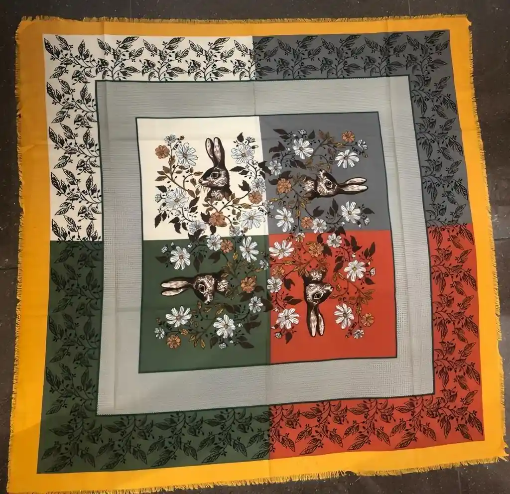 Pañuelo con diseño de conejos en tonos tierra. Tejido suave y delgado. Ideal para media estacion