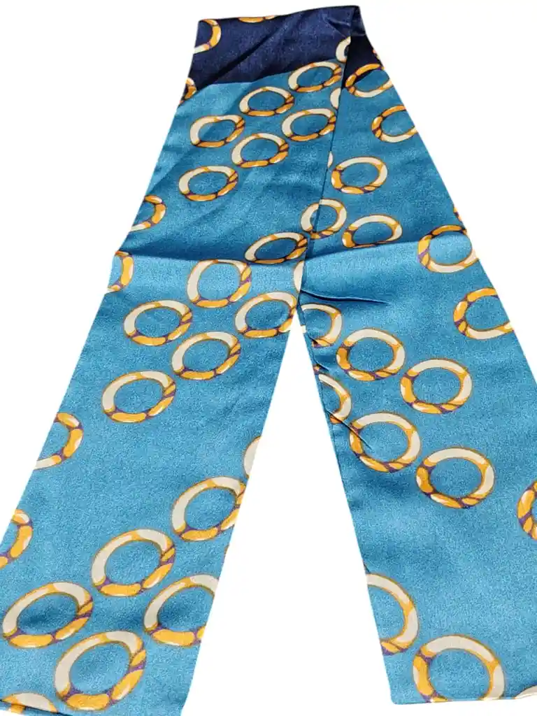 Twilly de estilo moderno con patrón de aros dorados sobre fondo azul, pensado para elevar cualquier look con un toque refinado. Su diseño equilibrado y su caída suave lo hacen perfecto para múltiples usos, desde el cuello hasta el bolso. Un accesorio atemporal y elegante. 93cm Largo.
