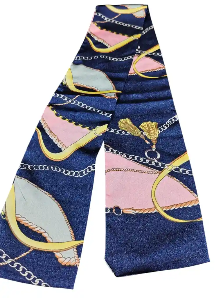 Panel estilo twilly con un diseño sofisticado de cadenas y lazos en tono dorado, sobre un fondo azul marino profundo, combinado con suaves acentos en rosa empolvado y celeste. Un accesorio versátil y atemporal que eleva cualquier look: úsalo en el cuello, en el cabello, en la muñeca o anudado a tu cartera. Ideal para mujeres que disfrutan de los detalles clásicos con un aire moderno y femenino. 93 cm de largo