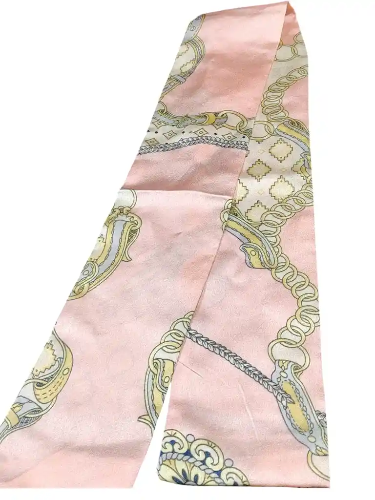 Pañuelo estilo Twilly de acabado satinado en tono rosé suave, con un elegante estampado de cadenas ornamentales y detalles geométricos en tonos marfil, dorado y azul profundo. Su diseño de inspiración clásica aporta sofisticación y versatilidad, ideal para anudar al cuello, muñeca, cabello o bolso, elevando cualquier look con un toque refinado y atemporal.