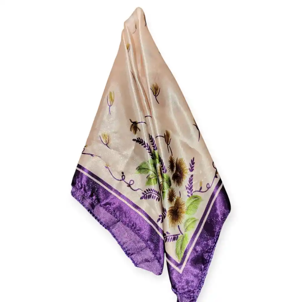 Pañuelo de acabado satinado con delicado estampado floral en tonos lavanda, verde y suaves acentos dorados sobre fondo marfil. Su borde en color púrpura profundo enmarca el diseño y aporta contraste y sofisticación. Elegante y femenino, es un accesorio ideal para dar un toque romántico y refinado a cualquier look, ya sea al cuello, en el cabello o como detalle decorativo en bolsos.
