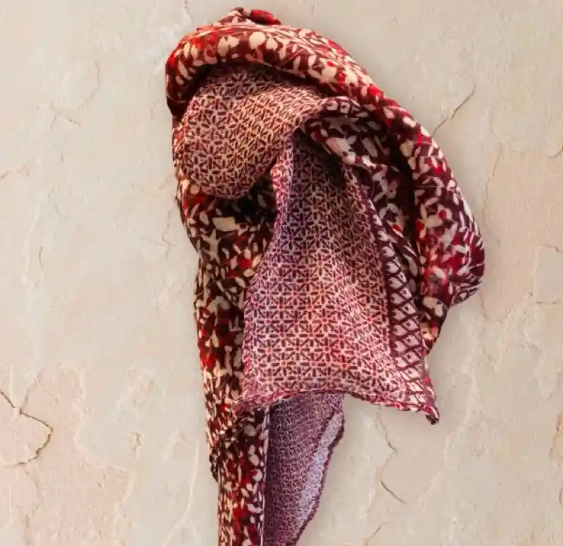 Pañuelo flores estampado en tonos rojos, suave y ligero. Grande. Textura: delgado y liso.