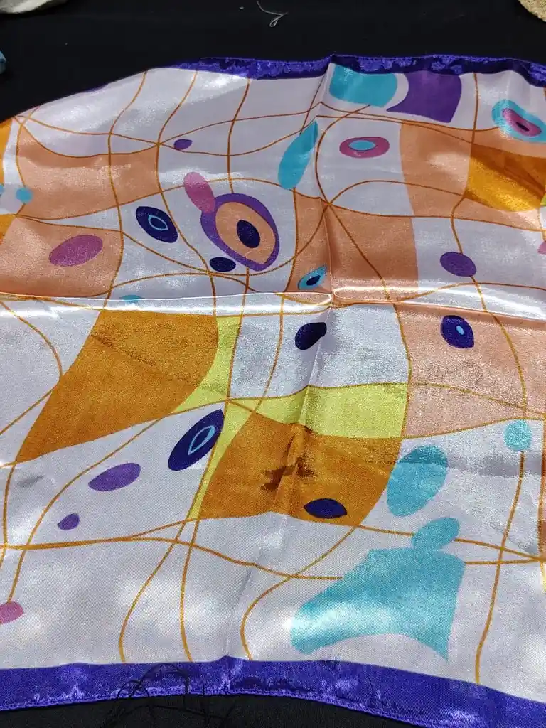Pañuelo de 50 × 50 cm con diseño abstracto y composición geométrica en tonos cálidos y fríos, que combinan mostaza, turquesa, lila y violeta sobre fondo claro. Sus líneas curvas y formas orgánicas crean un efecto dinámico y contemporáneo, ideal para aportar color y personalidad a cualquier look. Perfecto para usar al cuello, en el cabello o como detalle decorativo en bolsos. Un accesorio versátil, moderno y lleno de carácter artístico.
