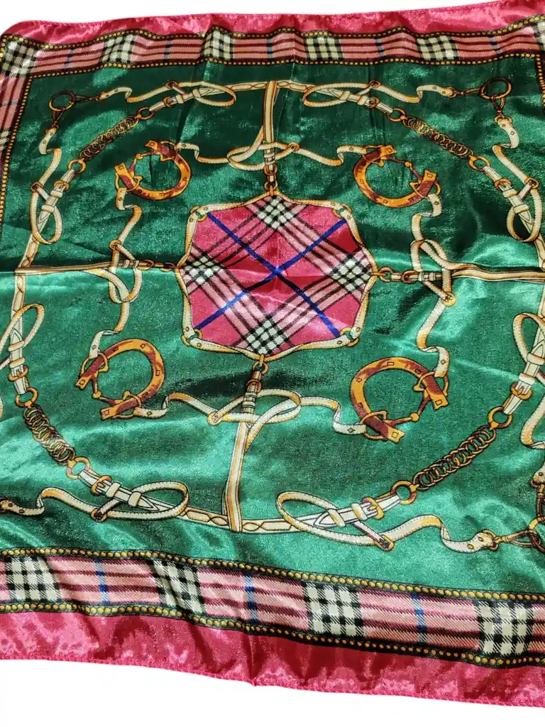Pañuelo de 50 × 50 cm con diseño clásico de herrajes, cadenas y herraduras sobre fondo verde intenso, combinado con detalles en tonos dorado, vino y un patrón de cuadros en el centro que aporta contraste y carácter. Su composición elegante y equilibrada lo convierte en un accesorio sofisticado y atemporal. Ideal para usar al cuello, en el cabello o como detalle decorativo en bolsos. Un pañuelo con presencia, pensado para quienes prefieren accesorios clásicos con fuerza visual y estilo definido.