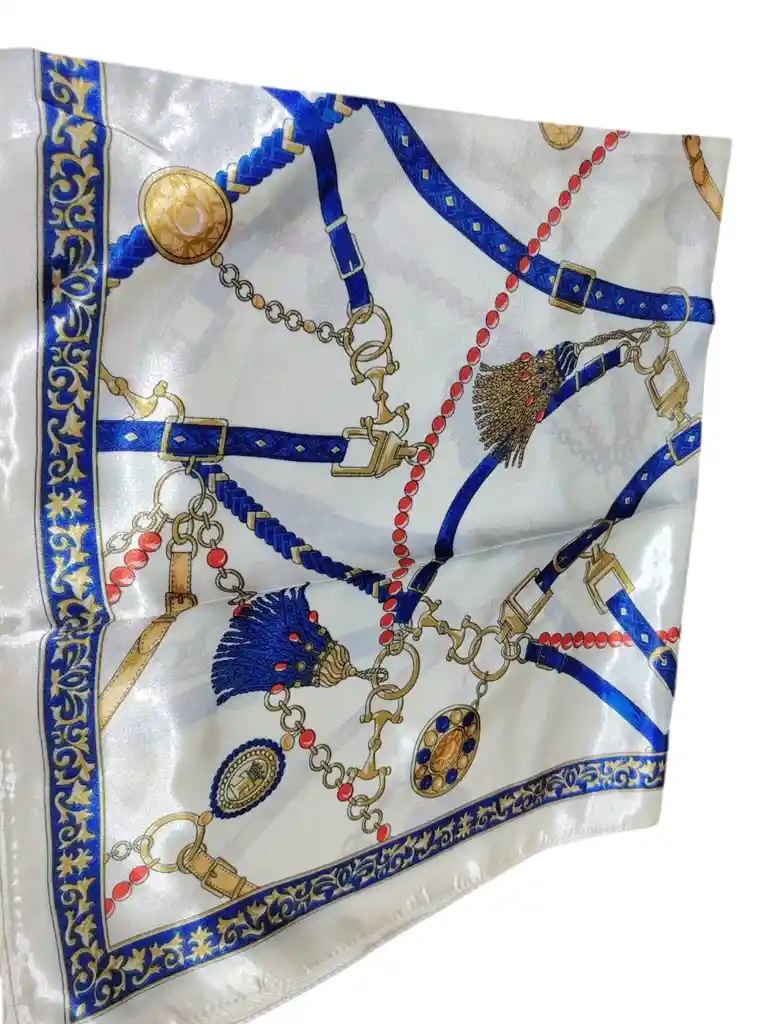 Pañuelo satinado de 85 x 85 cm, con diseño elegante de cadenas y detalles en tonos azul, dorado y rojo sobre fondo claro. Tela suave, ligera y con acabado brillante. Tamaño ideal para usar en el cuello, el cabello, como accesorio para cartera o incluso como top.