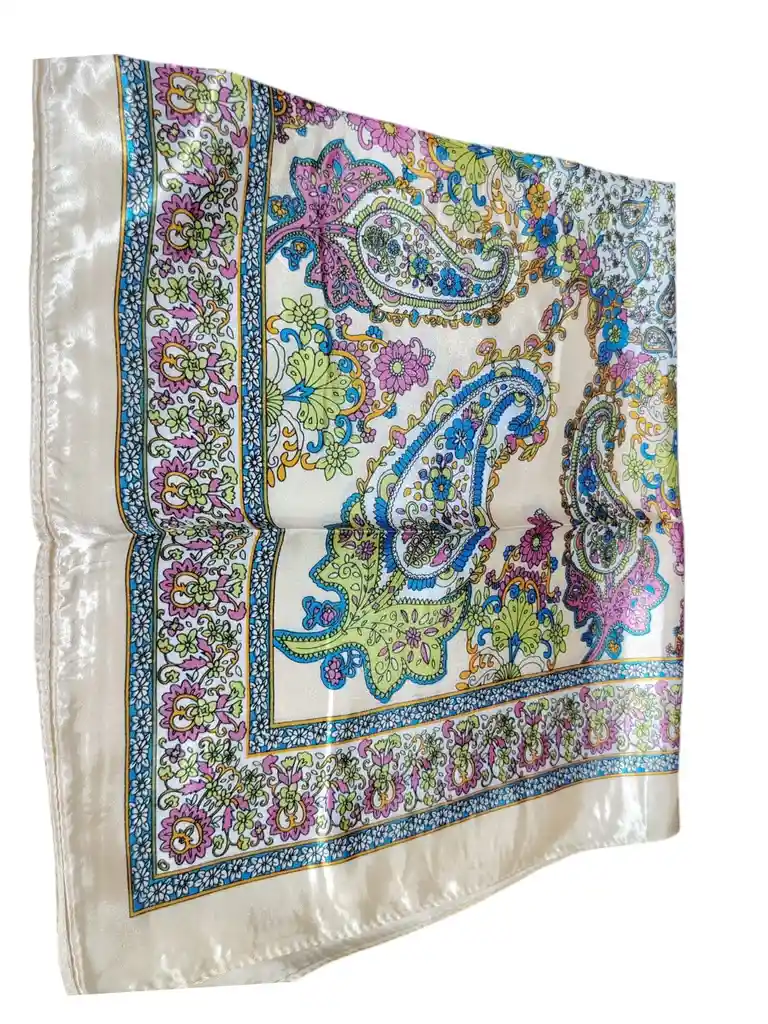 Pañuelo satinado de textura suave y brillo delicado, con un diseño floral y paisley que transmite elegancia y frescura. Un toque especial que realza cualquier look con sutileza y estilo. Medidas 85 x 85 cm