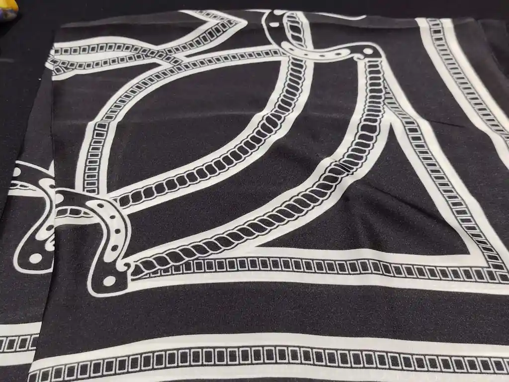 Pañuelo de 70 × 70 cm en color negro, con elegante estampado de cadenas y herraduras que aporta un estilo clásico y sofisticado. Su diseño equilibrado combina fuerza y elegancia, ideal para complementar looks formales o elevar atuendos cotidianos con un toque distintivo.Versátil y atemporal, puede usarse al cuello, en el cabello o como accesorio para bolso. Un pañuelo con carácter, pensado para quienes prefieren detalles clásicos que nunca pasan de moda.