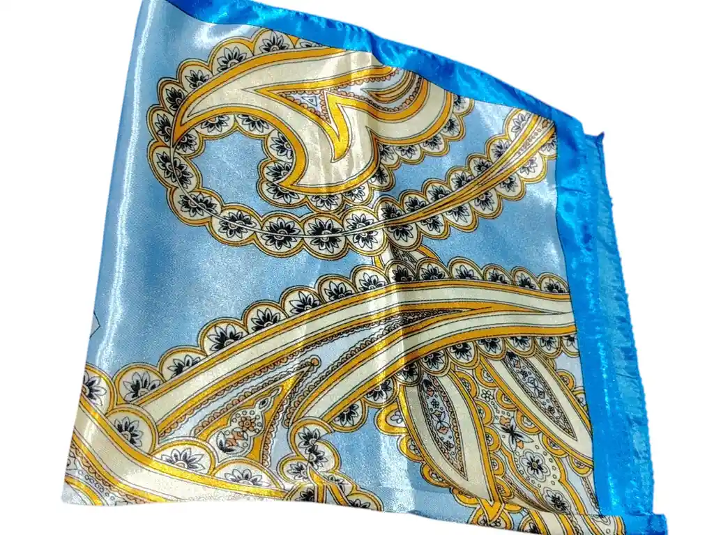 Pañuelo de acabado satinado con diseño ornamental de inspiración clásica, protagonizado por delicados motivos curvos y detalles decorativos en tonos celeste, marfil y acentos dorados. Su marco en azul vibrante aporta contraste y realza el brillo suave del tejido, logrando una pieza elegante y llamativa. Ideal para llevar al cuello, en el cabello o como accesorio en bolsos, aporta un toque sofisticado y atemporal a cualquier look. 50X50cm