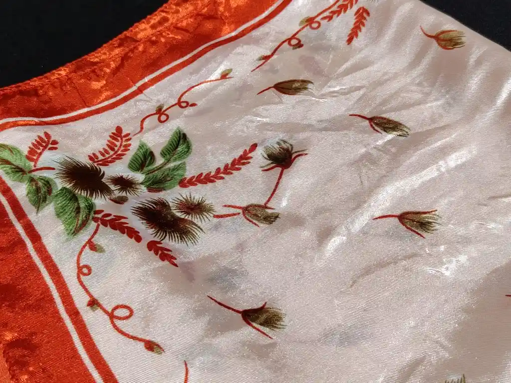 Pañuelo satinado en tono rosado claro, con diseño floral delicado y borde rojo estilo ladrillo. Tela ligera, de tacto suave y acabado brillante. Un accesorio femenino y elegante que aporta un toque cálido y sofisticado a cualquier look. Ideal para usar en el cuello, el cabello, la muñeca o como accesorio para cartera.