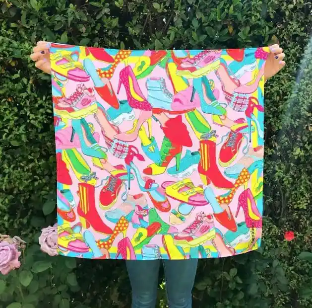 ¡A todas nos encantan!, por lo que no podíamos dejar de crear esta total oda dedicada a nuestros queridos «scarpe». Este colorido pañuelo logra reunir y combinar de una manera casi perfecta una variedad enorme de zapatos, todos distintos entre sí y para todos los gustos. De esta forma, y con una mirada lúdica, ponemos en valor la importancia de la diversidad y de cómo todos podemos coexistir. Un par de zapatos no solo viste nuestros pies, sino que también dice mucho sobre nuestra personalidad. ¿Te animas a usar este pañuelo y hacer el mejor match con tus zapatos favoritos? Hecho con seda poliéster conformada por un 67% de botellas de plástico recicladas, lo cual es parte de nuestro plan de convertirnos en una marca totalmente consciente y comprometida con el medio ambiente. Medida: 68 x 68 cm aprox. Tela: Seda poliéster