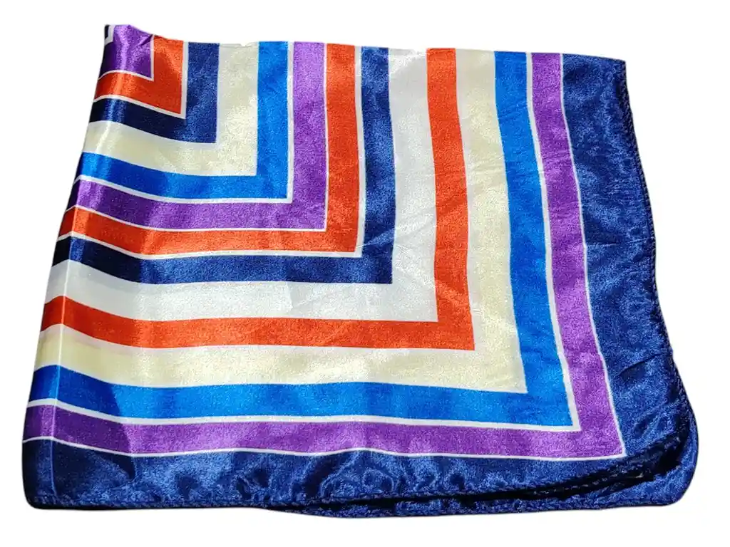 Pañuelo de textura sedosa con diseño multilíneas en una vibrante combinación de colores intensos como azul oscuro, azul rey, morado y rojo, equilibrados con tonos beige que aportan armonía al conjunto. Su acabado suave y brillante realza la profundidad del color, creando un accesorio moderno y dinámico. Ideal para añadir carácter y estilo a cualquier look, ya sea al cuello, en el cabello o como complemento decorativo en bolsos.