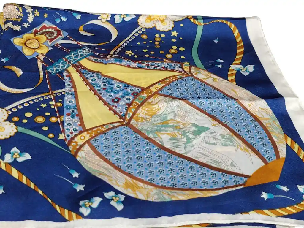 Pañuelo decorativo con diseño de globo aerostático sobre fondo azul, detalles de estrellas, luna y flores en tonos dorados y celestes. Elegante, llamativo y fácil de combinar.70x70cm