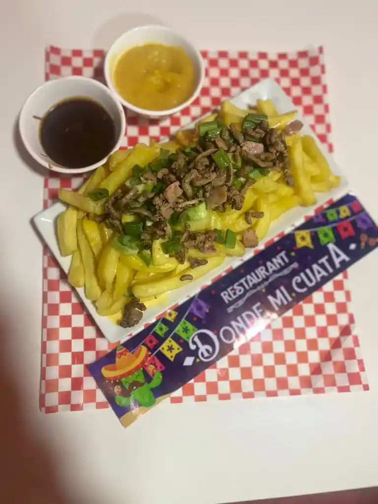 Papas fritas con carne tocino, cebollin, salsa cheddar