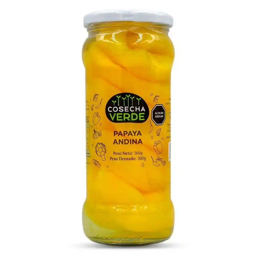 Papayas cocidas muy similiares a las del norte chileno.. Ingredientes: Papaya Andina, Agua, Azúcar Blanca, Ácido Cítrico (SIN-330) y Ácido Ascórbico (SIN-300). Hecho en Perú