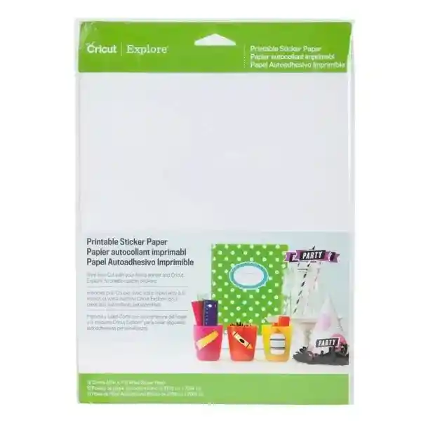 Para usar con impresoras de inyección de tinta y la función de impresión, corte y corte de la máquina Cricut Explore® Elija la configuración personalizada "Papel de pegatina imprimible" para un corte suave, que corta el papel de pegatina y deja el respaldo intacto para una fácil aplicación Pegatina imprimible el papel se adhiere bien a la mayoría de las superficies y no es reposicionable Mantenga las imágenes impresas secas para preservar la longevidad Use el software de su impresora para calibrar los colores antes de imprimir para obtener resultados óptimos Haz calcomanías coloridas de bricolaje con papel adhesivo imprimible Cricut®. La función Imprimir luego Cortar le brinda infinitas posibilidades de color, utilizando su impresora domÃ?©stica y la máquina Cricut Explore® para imprimir y cortar casi cualquier imagen de manera limpia y precisa, ¡no se requieren tijeras! La biblioteca de imágenes de Cricut® contiene más de 50,000 imágenes listas para imprimir y cortar, y el sangrado de color de coincidencia automática asegura que nunca tendrás que recortar el espacio en blanco adicional de tu proyecto. Tenga en cuenta: Para obtener los mejores resultados, retire todo el papel de la bandeja de la impresora, luego coloque una hoja de papel adhesivo en la impresora a la vez