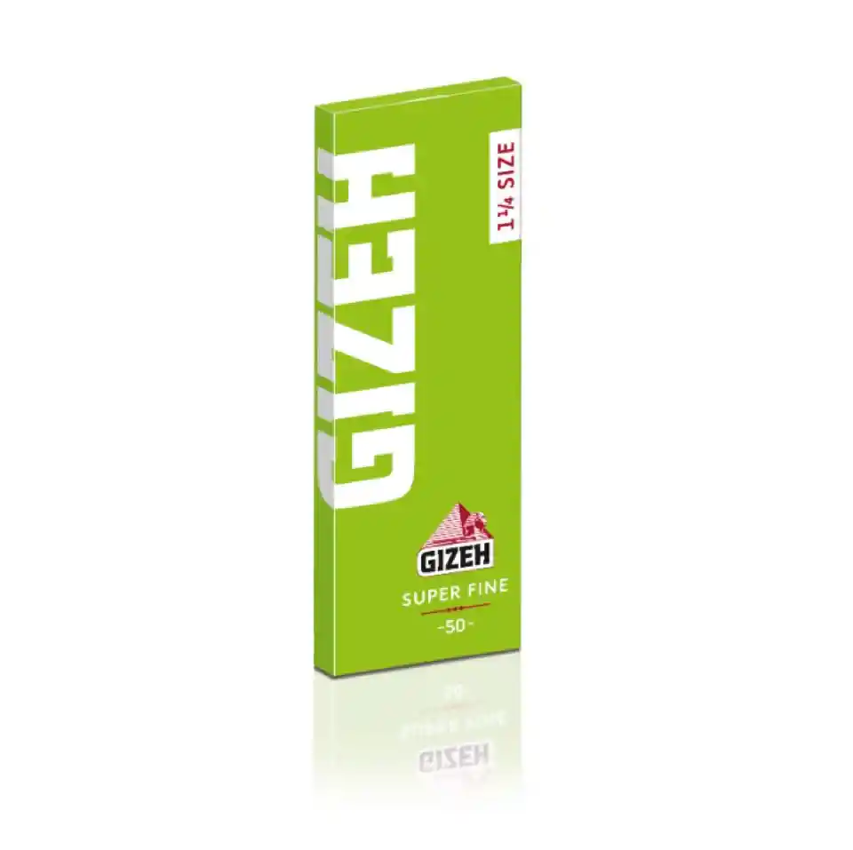 Gizeh verde super fino 1 ¼ verde, de combustión muy lenta, su tira de goma árabe natural sacado del árbol de acacia hace mas fácil su pegado. Formato: 1 ¼ Tamaño: 44 x 78 mm Libreto: 50 hojas